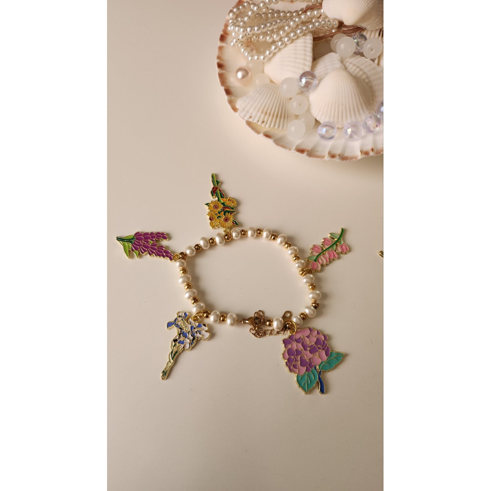 The bracelet is stainless steel rings and brass/steel pendants.