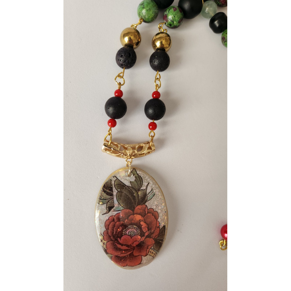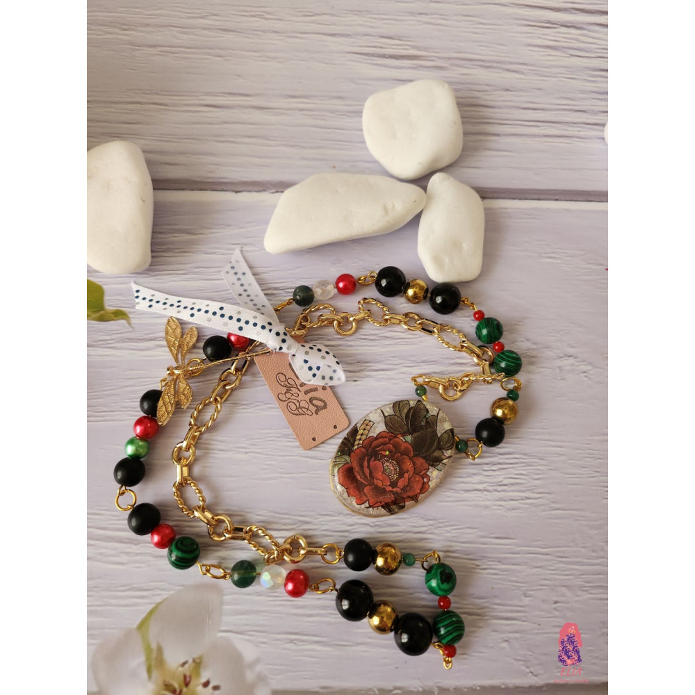 Total weight 59 grams. Length 35 cm. Crafted with semi-precious stones - malachite, powder coloured hematite, black onyx, pearls, beads.
