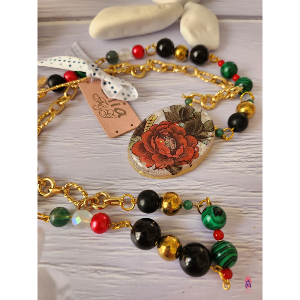 The necklace is made of steel chain with a thickness of 0.9 cm. The element is made of jewellery resin,