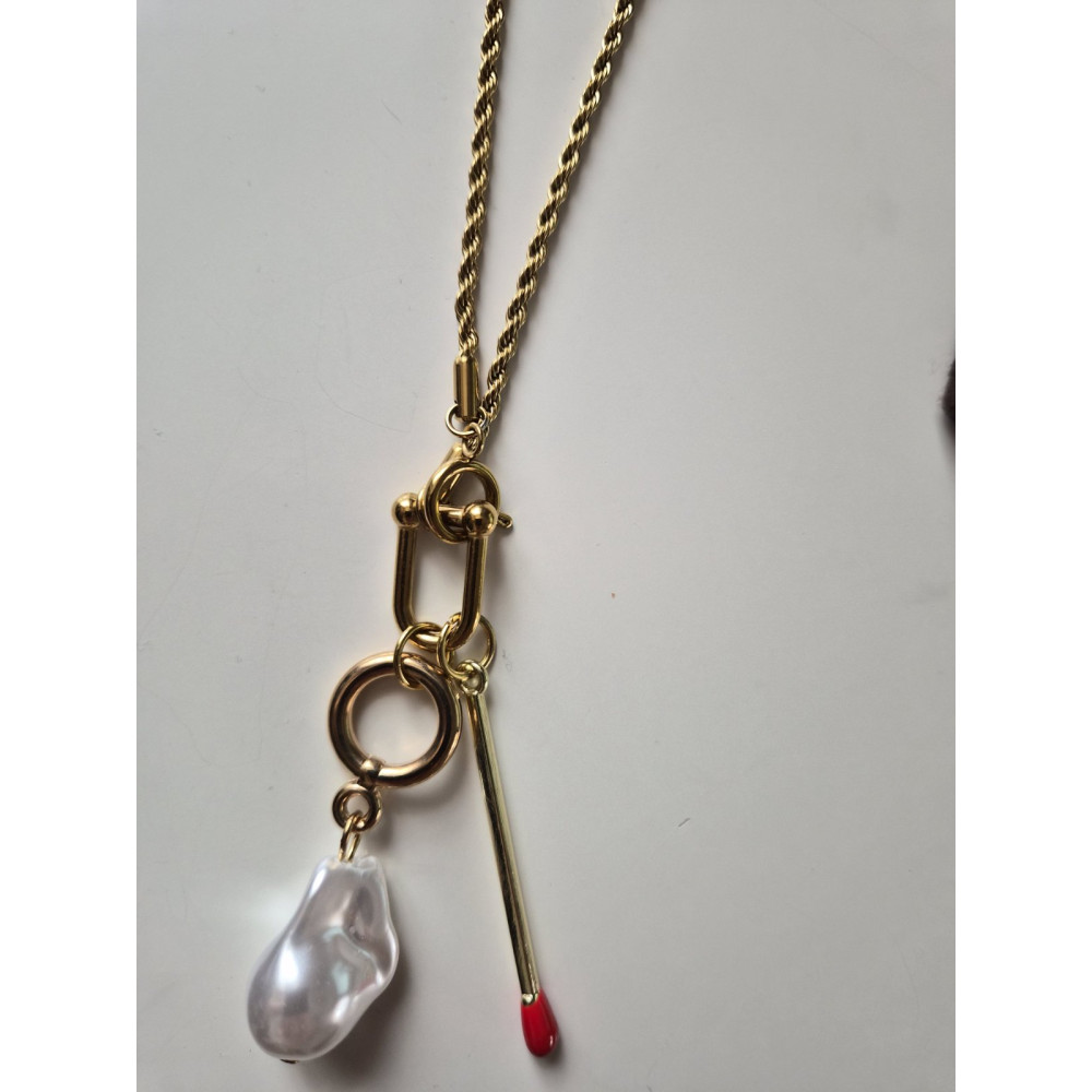 Make a statement with this bold, contemporary necklace. Featuring a steel chain, it’s paired with a striking DIY steel pendant that exudes artistry and sophistication. Sleek, edgy, and effortlessly chic—this piece is designed to turn heads .Artificial pearl Majorca .Necklace is on your neck.