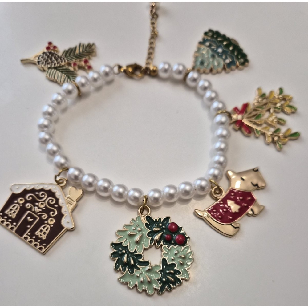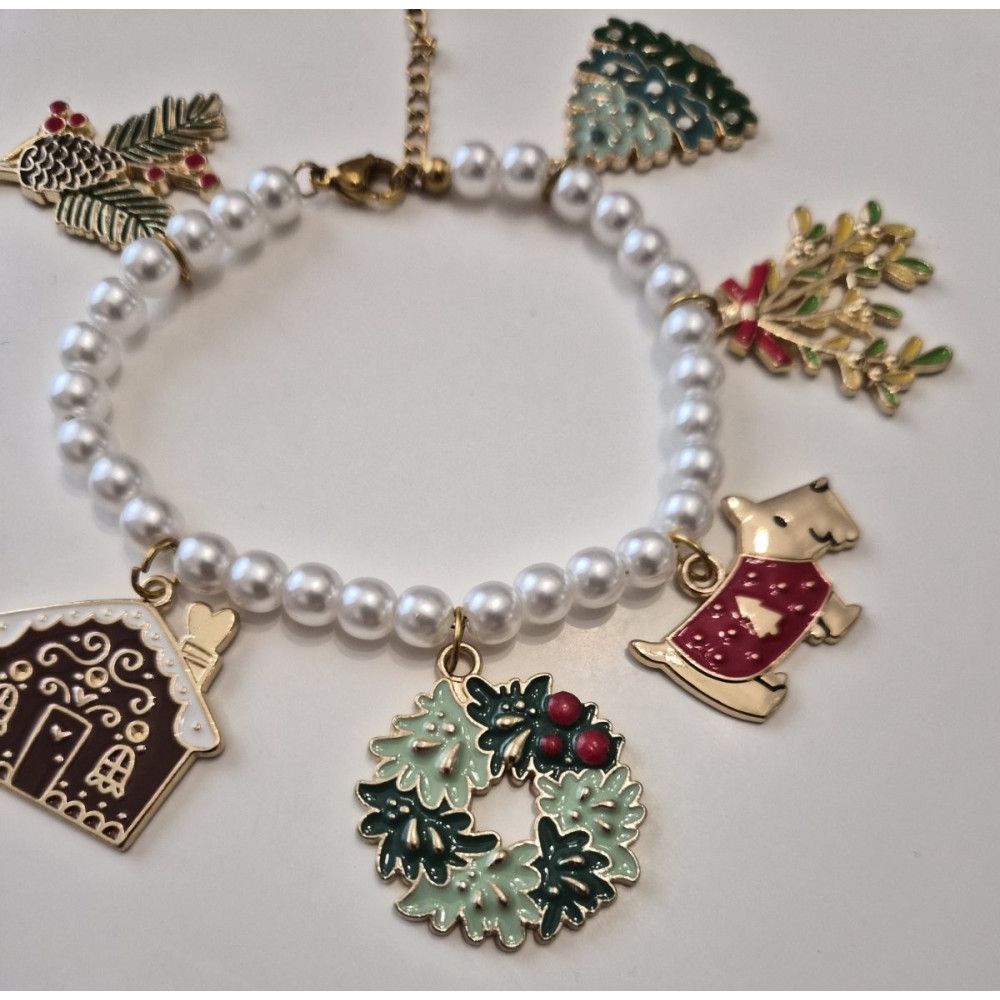Гривната е изработена от перли Майорка и стомана/месинг елементи.