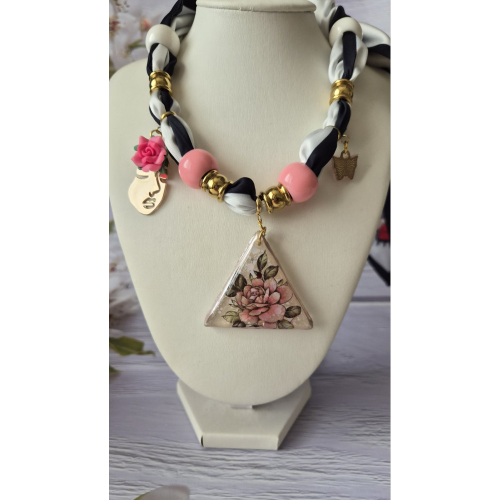 Декориран с месинг-стомана, пеперуда в розово и акрилни топчета,месинг елемент лице с акрилна роза, стомана халки, шал-колиѐто съчетава модерна елегантност и универсалност.