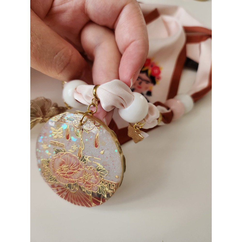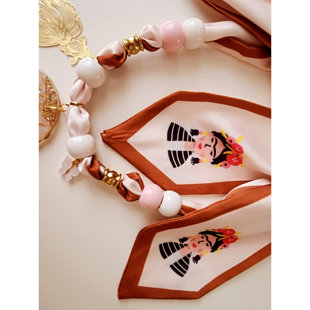 С дължина 120 см и ефектна висулка от смола със златен кант (5×5см), този аксесоар е идеален за носене като шал, колие или декорация за чанта.
