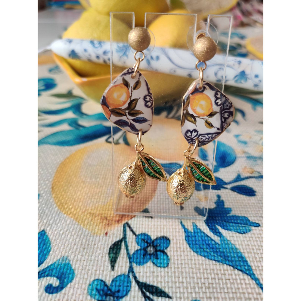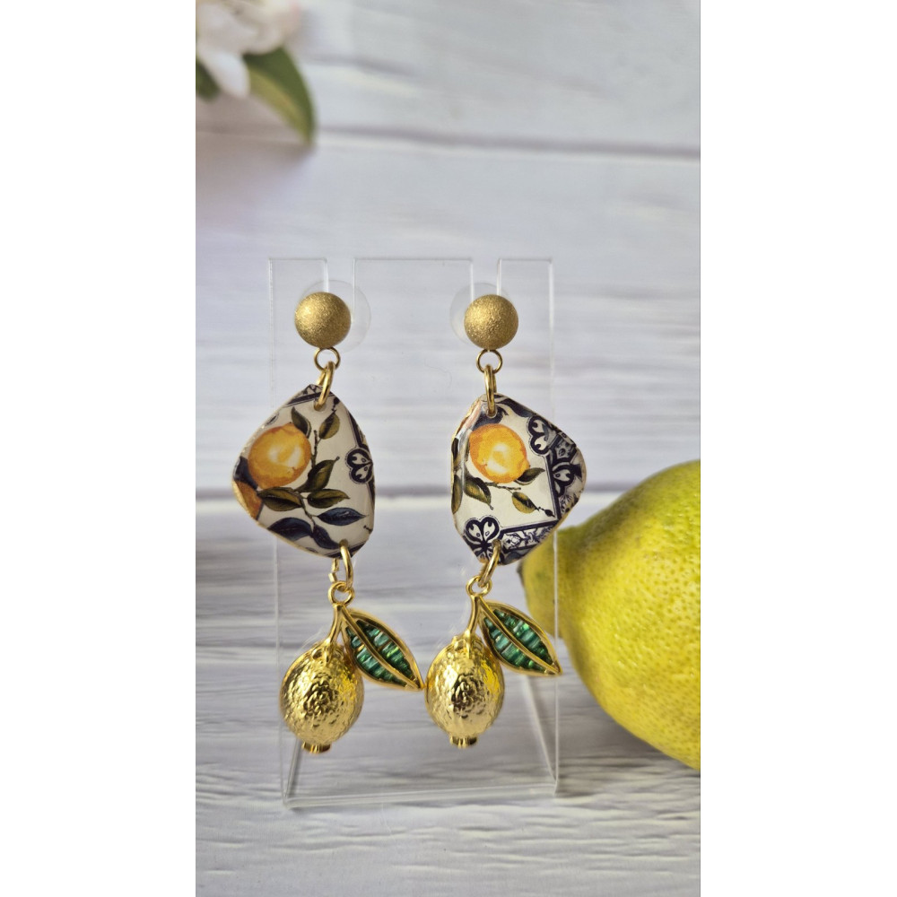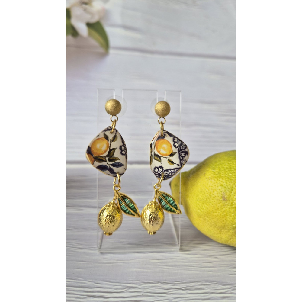 Всяка двойка е фино завършена и поставена върху винт от неръждаема стомана, която осигурява издръжливост и безупречен блясък. Висулки лимони от съомана и златен кант.